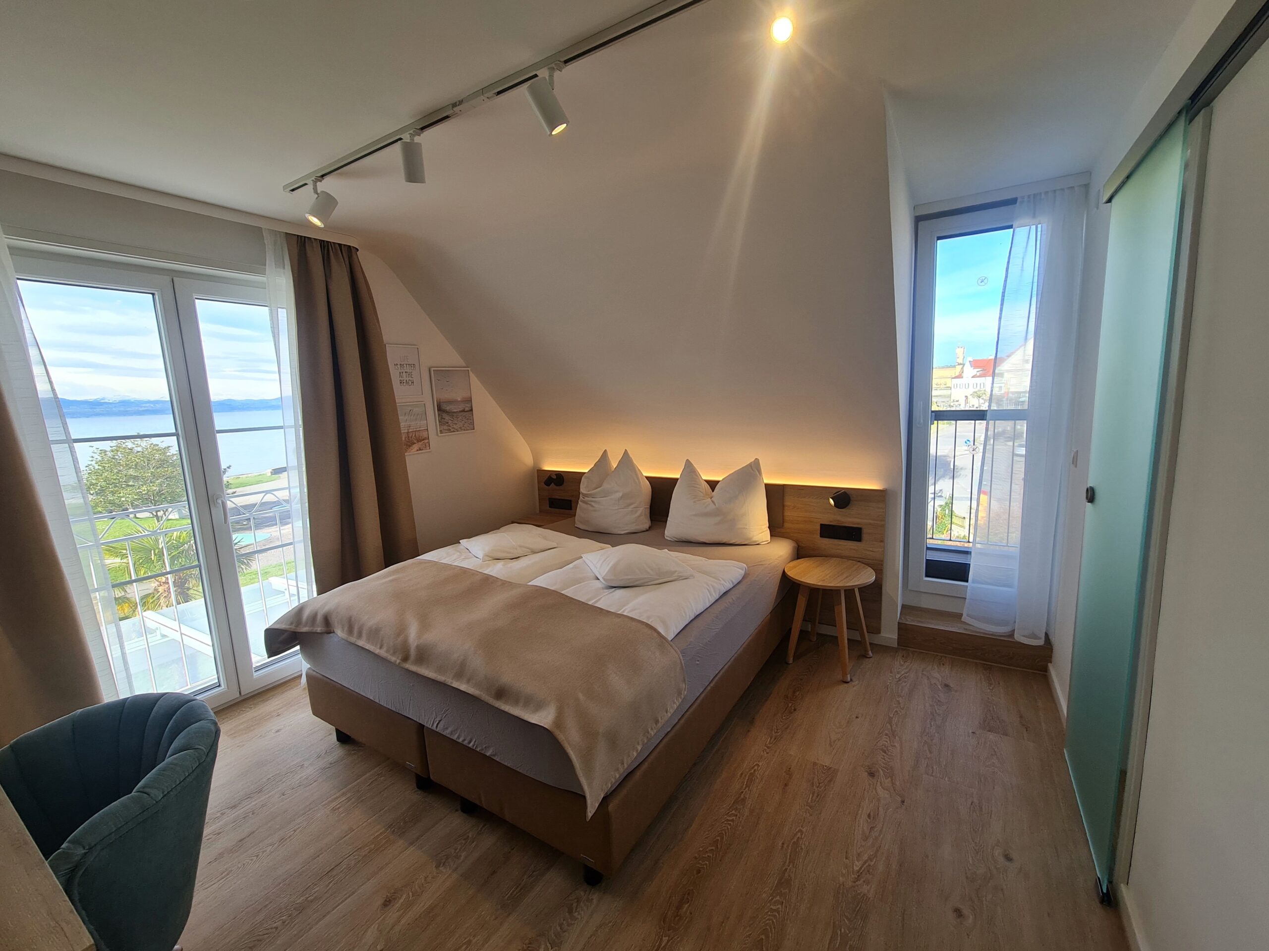 In der zweiten Etage gelegenes Doppelzimmer mit Dusche/WC mit direktem Seeblick und Loggia seitwärts Richtung Westen genießen Sie einen herrlichen Blick auf den See mit Hafen und Schloß Montfort von Langenargen in unserem Gästehaus Seeblick. Starten Sie Ihren Urlaubstag mit einem vorzüglichem Frühstück auf unserer großen verglasten Terrasse in der ersten Etage. Die Terrasse mit herrlichem Ausblick auf den Bodensee und Alpen sowie Aufenthaltsräume stehen Ihnen zusätzlich jederzeit zur Verfügung. Wir bieten für unsere Gäste einen Getränkekühlschrank zur Selbstbedienung mit Getränken jeglicher Art zu günstigen Preisen auch mit Weinen aus der Region an.